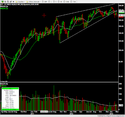 A lot of stocks on the Market Smith Growth 250+ list have made runs of 20%-100% since the beginning of this intermediate up trend that began on on the low of 11/16/12 and really got moving on 12/31/12. For me, just because the Indexes are starting to act sloppy and erratic doesn't mean I am hoping on the short side and I am not cutting my longs either. This is one of those times where less is more. I have taken profits in most of my winning positions and down to core size in each. Trails stops set in what I have left.